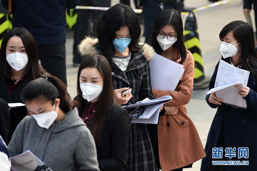 3月17日,在清华大学,几名学生戴着口罩等候进入招聘会现场。当日,北京空气重污染黄色预警及霾黄色预警继续。北京市气象台、北京市环保监测中心16日联合研判,随着冷空气结束,本周京津冀将出现2016年以来持续时间最长的重污染过程,17日-18日污染最重,空气质量达5级重度污染,预计19日有所缓解,至22日逐渐消散。新华社记者 鞠焕宗摄