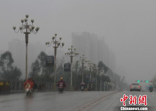 钦州市城区被大雾笼罩,市民穿雨衣出行。 凌福龙 摄