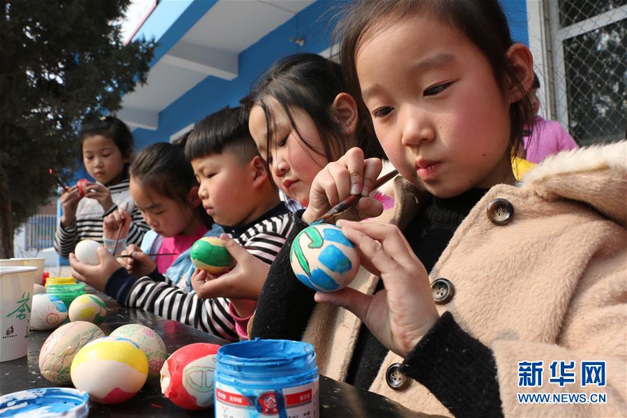 3月20日,河北省广平县明德小学的小学生们在画彩蛋,准备玩“立蛋”游戏。