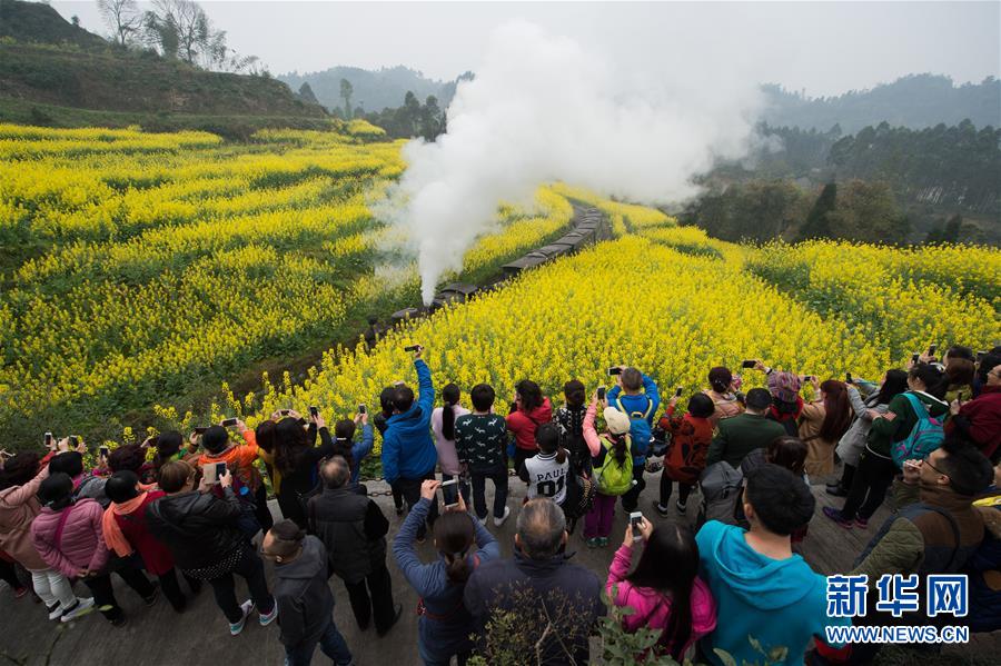 3月20日,众多游客拍摄从花海中驶来的嘉阳小火车。新华社记者 江宏景摄