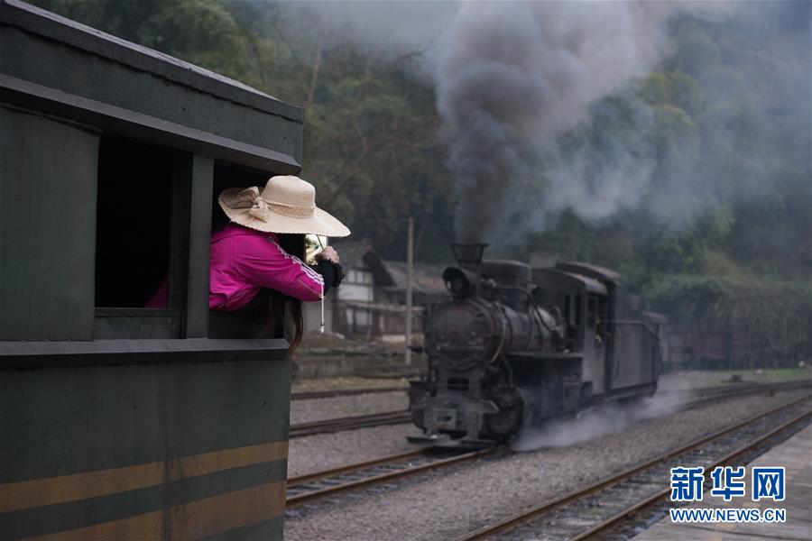 3月20日,一名游客拍摄运行中的嘉阳小火车车头。新华社记者 江宏景摄
