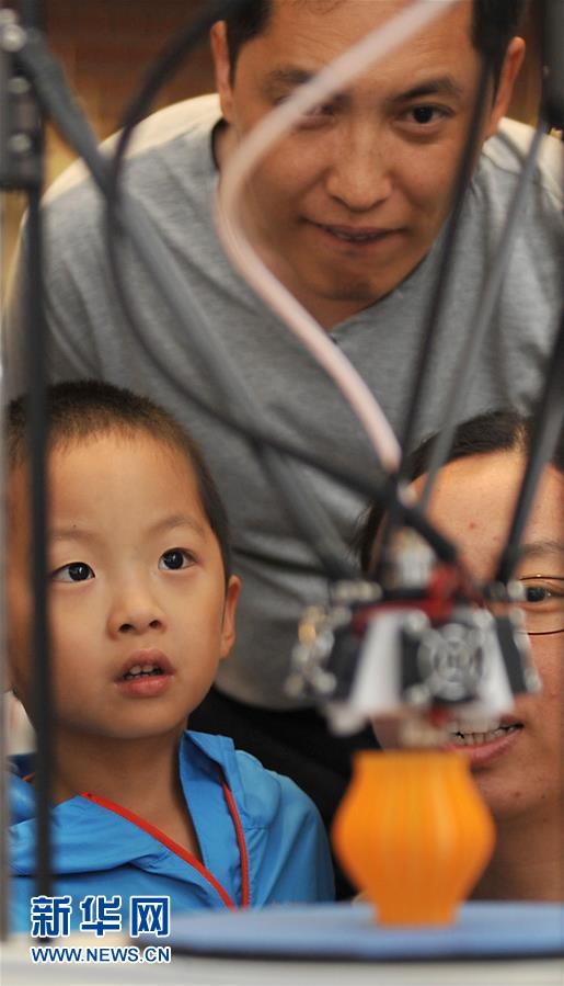 5月14日,家长和孩子在天津市科技周主场活动中观看3D打印机。新华社发(连漪 摄)