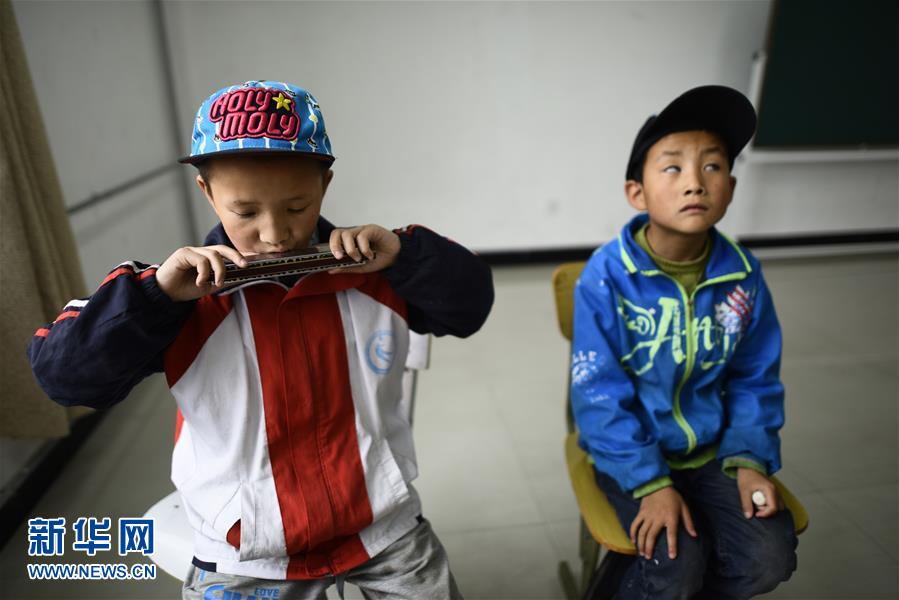 5月13日,在青海省特殊教育学校盲教部一年级的教室中,刘慧(左)在吹口琴,张永发在旁边听得入神。新华社记者张宏祥摄