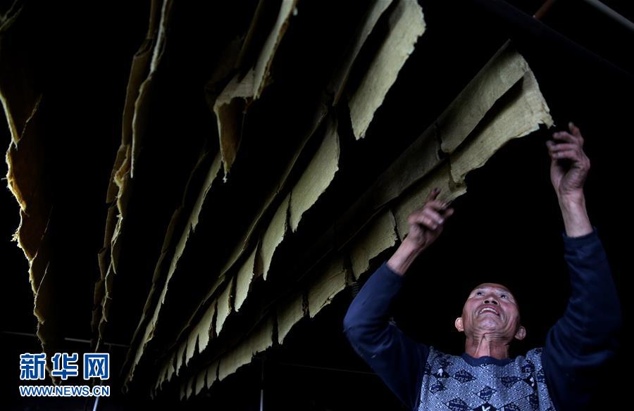 5月13日,李福安在家里晾纸。 新华社发(龙涛 摄)