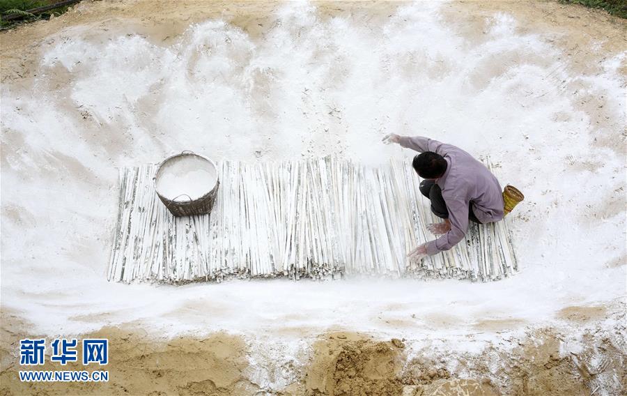 5月12日,李福安在竹条上撒石灰。新华社发(龙涛 摄)