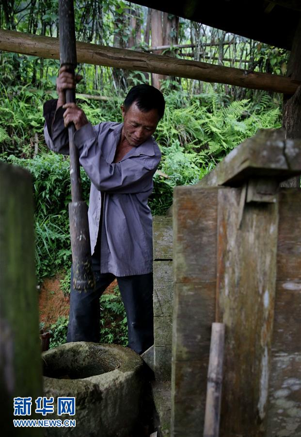 5月12日,李福安在舂捣沤软的毛竹条。 新华社发(龙涛 摄)