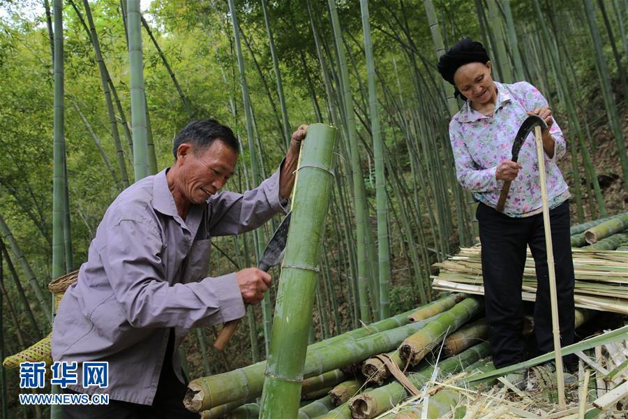 5月12日,李福安在破竹子,他的妻子李梅花在一旁帮忙。新华社发(龙涛 摄)