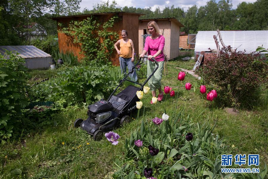 5月28日,在俄罗斯图拉市郊,两名女子修剪院子里的草坪。 新华社记者白雪骐摄