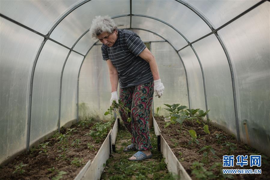 5月28日,在俄罗斯图拉市郊,一名女子在自家院子里的大棚中劳作。 新华社发(叶甫盖尼·西尼岑摄)