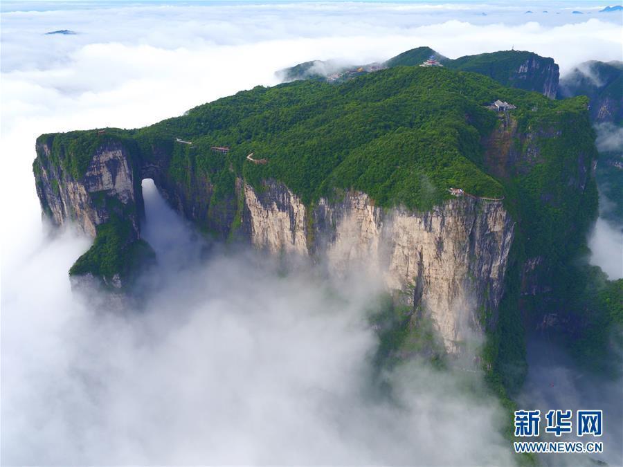 6月29日,雨过天晴的湖南张家界天门山国家森林公园云雾缭绕,峰峦浮上云端,如梦似幻,宛如仙境。 新华社发 向韬 摄 图片来源:新华网