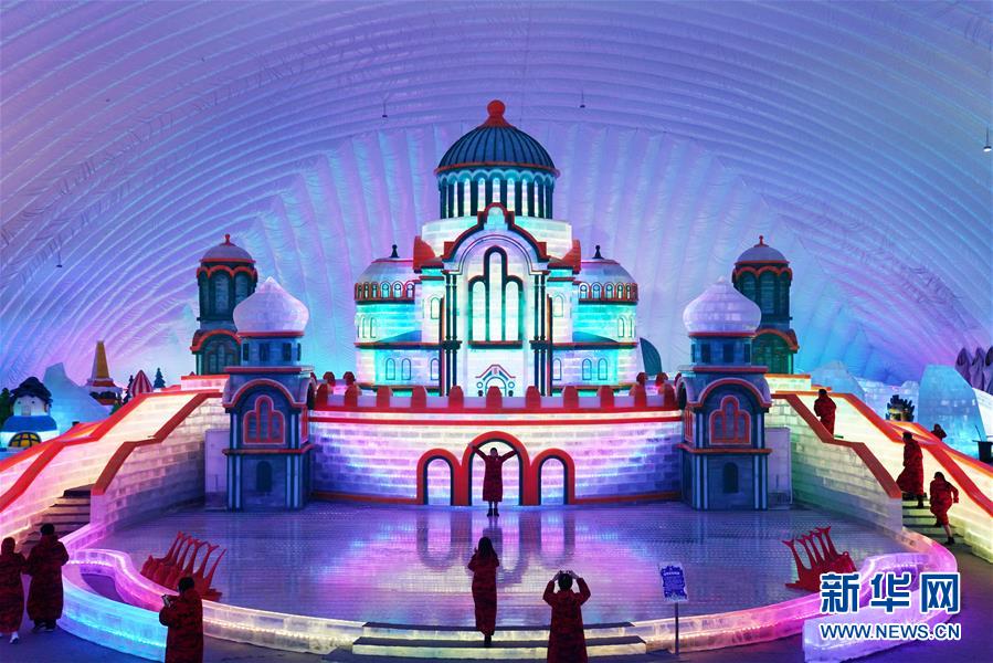 在哈尔滨冰雪大世界室内冰雪主题乐园,游客在拍照、游玩(7月28日摄)。
