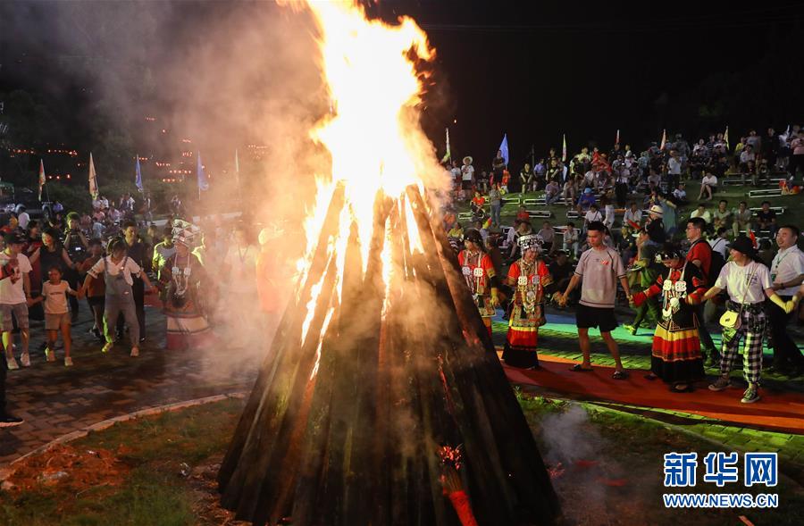 7月26日,在西昌市洛古波乡火把场,游客和当地群众围着火把载歌载舞。 当日,四川省凉山彝族自治州西昌市火把节在火把狂欢夜中拉开序幕。火把节期间,各县市火把节的重头戏“火把狂欢夜”是最吸引人、参与度最高的盛会。 新华社记者 江宏景 摄