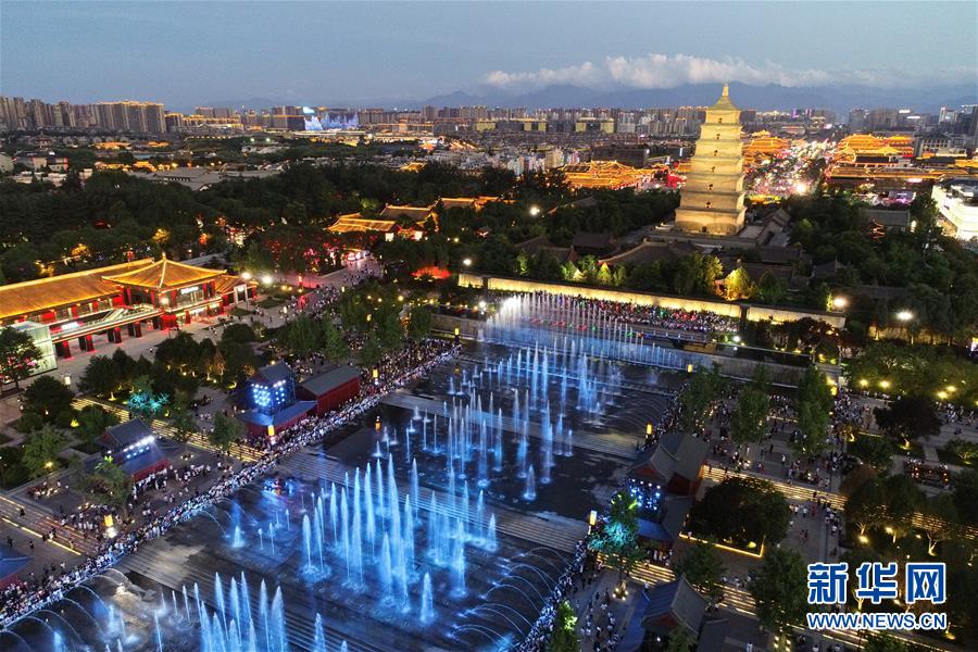 日暮时分的西安大雁塔文化休闲景区吸引众多游人游览(7月26日无人机拍摄)。新华社记者 邵瑞 摄