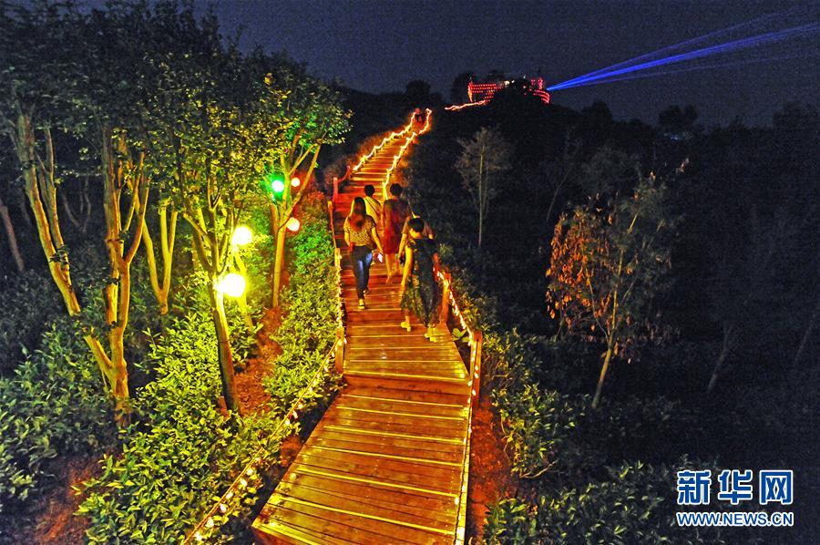 游客在欣赏浙江省安吉县灵峰街道剑山村蔓塘里自然村的“大地之光”艺术光影秀(7月20日摄)。