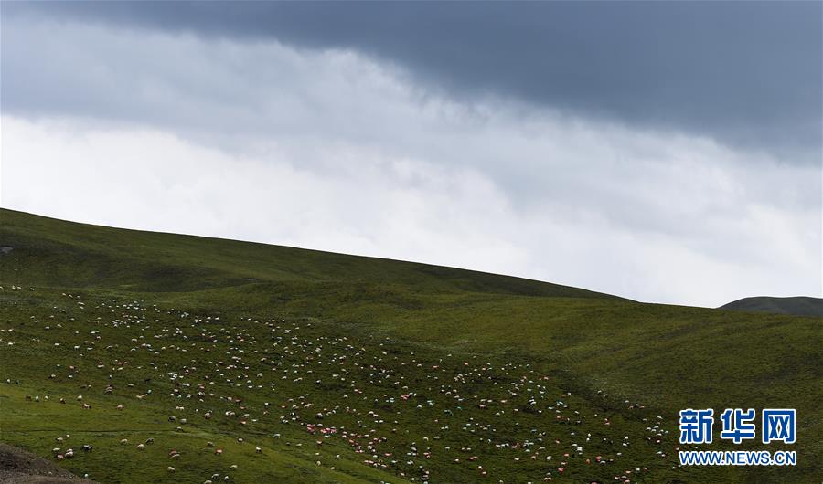 这是祁连山下牧场里的羊群(7月27日摄)。 夏日,青海省海北藏族自治州祁连县的牧场满目绿色,羊群被群山环抱,美如画卷。 新华社记者 吴刚 摄