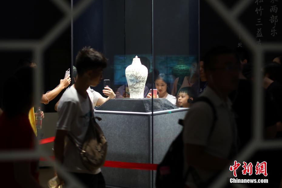 7月25日,南京高温持续,大批民众前往南京博物院,在清凉的环境中参观展陈的历史文物。图为民众被南京博物院镇院之宝之一的“明洪武釉里红岁寒三友纹梅瓶”吸引。中新社记者 泱波 摄
