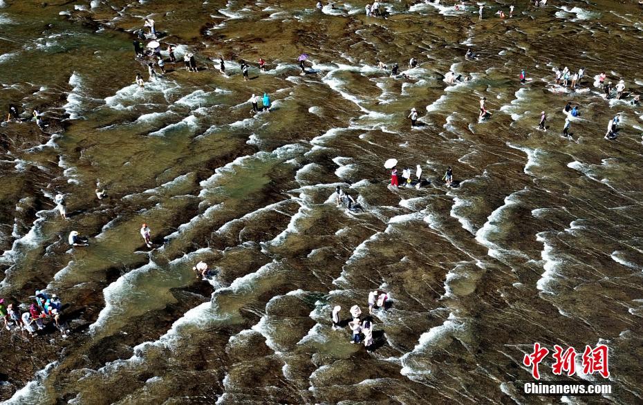 7月25日,空中航拍位于福建省屏南县的天然水上乐园——白水洋。白水洋由平坦的岩石河床一石而就,面积近8万平方米,河床布水均匀,水深没踝。在阳光下,水面波光粼粼。每年夏天,白水洋都吸引大批游客前来戏水玩乐。中新社记者 王东明 摄