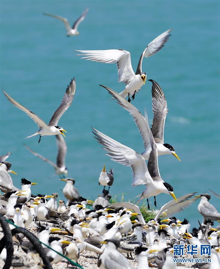 中华凤头燕鸥(嘴端黑色)和“近亲”大凤头燕鸥在一起(7月24日摄)。新华社记者 殷晓圣 摄