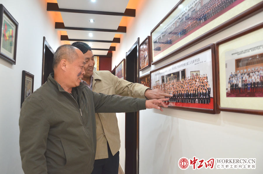 图为智呼声与老朋友、全国劳动模范郭晋龙一起,在家中观摩满墙的老照片,回忆起往昔的峥嵘岁月。 (中工网记者 笑语摄)