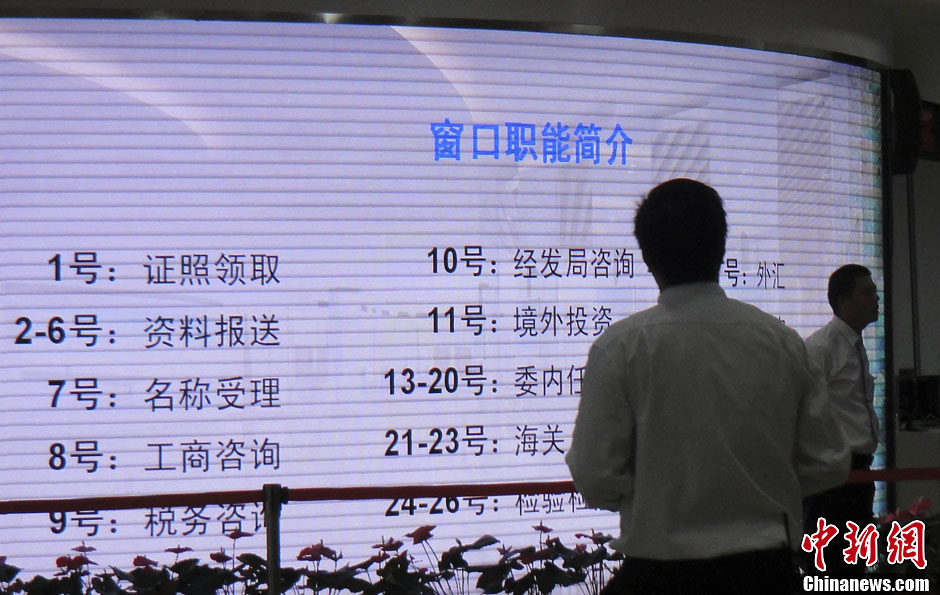 10月8日,中国(上海)自由贸易试验区综合服务大厅迎来首个业务受理日,尽管申城当日暴风骤雨,仍有不少企业热搭“头班车”,截至当日17时,服务大厅接受业务办理577人次,接受咨询服务达1480人次。中新社发 郑莹莹 摄