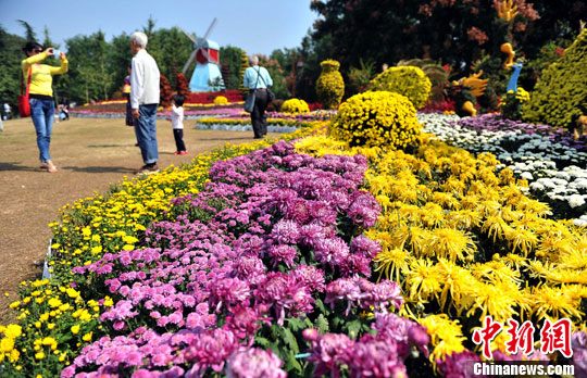 10月9日,武汉解放公园里,来自“菊城”开封的40万盆精品菊花在此展出。造型各异的菊花吸引市民游客驻足欣赏。中新社发 张畅 摄
