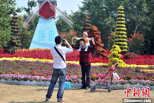 10月9日,武汉解放公园里,来自“菊城”开封的40万盆精品菊花在此展出。造型各异的菊花吸引市民游客驻足欣赏。中新社发 张畅 摄