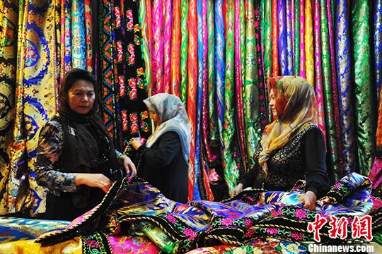 古尔邦节将至 新疆穆斯林民众传统用品热卖,在新疆库尔勒市团结市场,几位维吾尔族妇女在挑选族特色的床上用品。 确·胡热 摄