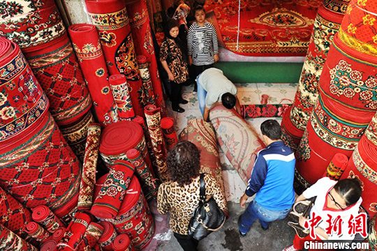 古尔邦节将至 新疆穆斯林民众传统用品热卖,在新疆库尔勒市团结市场,吐尔地·乌秀尔一家购买地毯。 确·胡热 摄