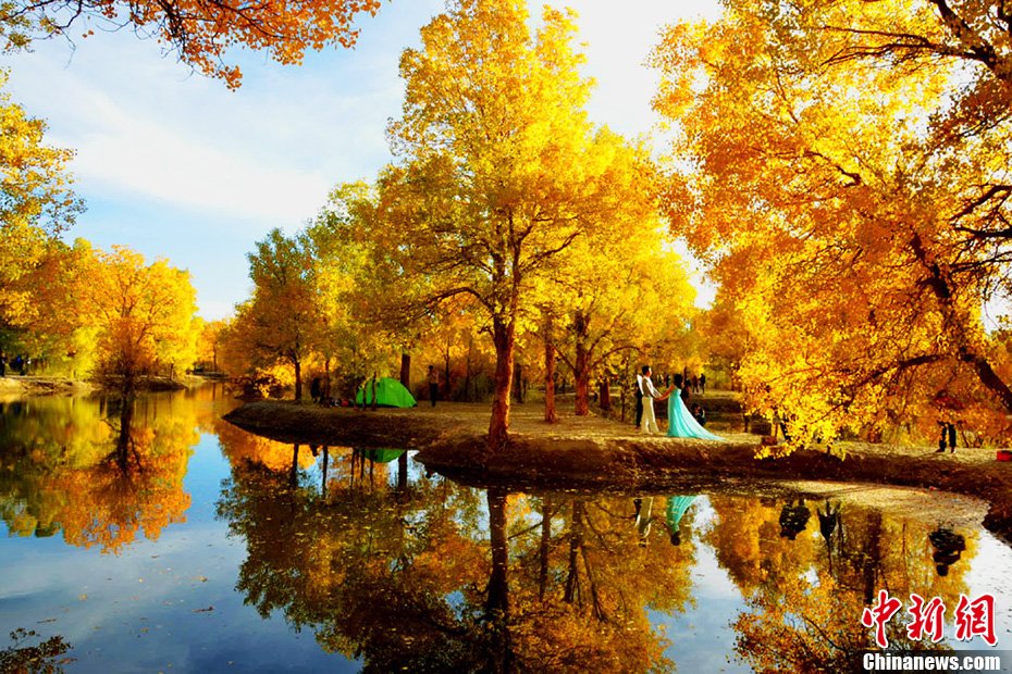 金秋十月,位于甘肃酒泉金塔县森林公园的胡杨林,金黄色的树叶与湛蓝的天空倒映在清澈的湖水中,如同美丽的油画一般,吸引了大批省内外游客纷纷前来赏景拍照。万宗平 摄