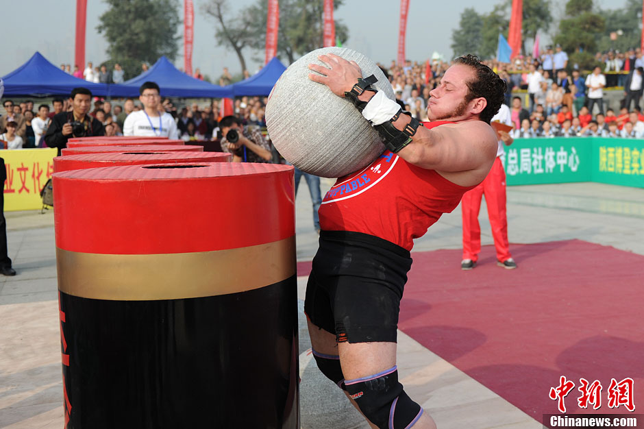 10月9日,2013年中国大力士挑战赛于陕西咸阳开赛,竞赛项目包括抱石球、提重物、挑重物、拉汽车等,赛期为10月9日至10日,来自国内外的22名选手参赛。张远 摄