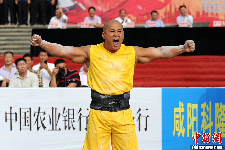10月9日,2013年中国大力士挑战赛于陕西咸阳开赛,竞赛项目包括抱石球、提重物、挑重物、拉汽车等,赛期为10月9日至10日,来自国内外的22名选手参赛。张远 摄
