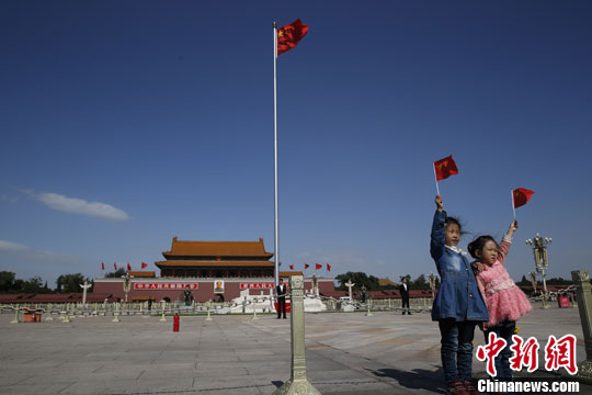 10月10日,北京天安门广场,两名儿童在手举国旗在风中留影。当日,北京发布大风蓝色预警,预计北京市大部分地区将出现5、6级偏北风,阵风可达7级左右。中新社发 盛佳鹏 摄
