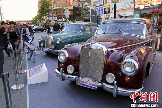 10月10日,王府井步行街上展出的老爷车吸引了路过的市民和游客。中新社发 李慧思 摄