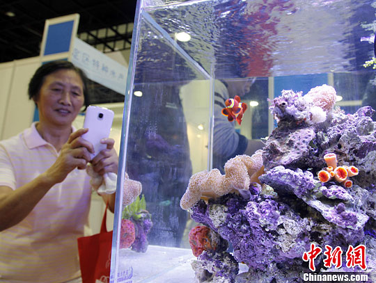 10月11日,第八届上海国际休闲水族展在上海农展馆开展。本次水族展以“缤纷水族、和谐生活”为主题。图为一位观众用手机拍下水族箱中的小丑鱼。中新社发 袁婧 摄