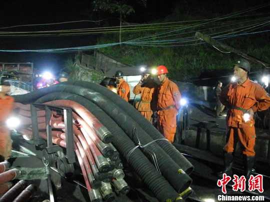 10月11日下午1时30分,贵州黔南州省惠水县长田乡大冲煤矿发生透水事故,7人被困井下。事故煤矿设计生产能力为9万吨每年,为证照齐全的生产矿井,事故原因目前仍在调查中。图为救援现场。中新社发 鲍光翔 摄