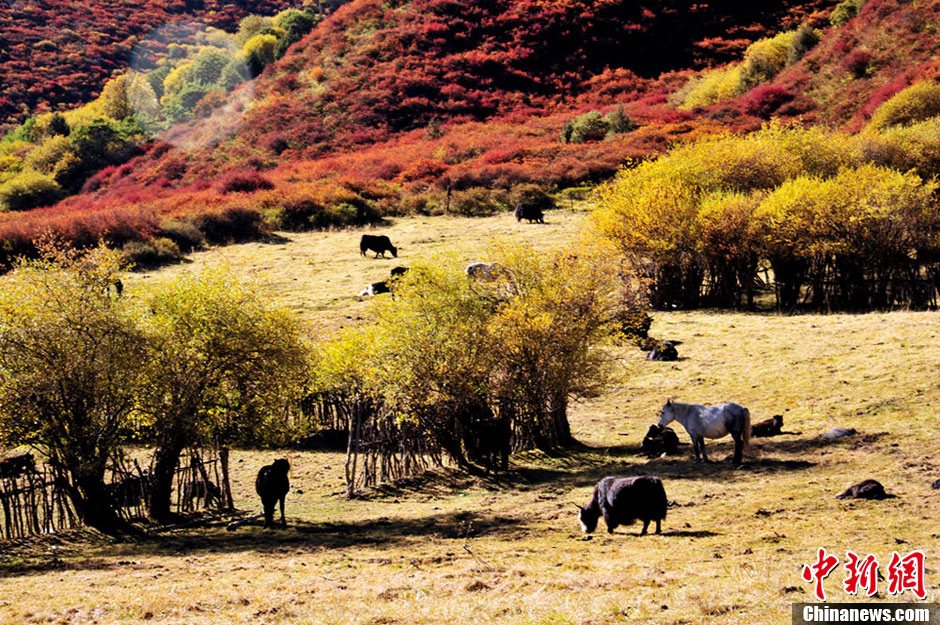 十月的红原草地天气晴好,秋色格外艳丽,红叶分外绚烂,让人流连忘返。谢宏程 摄