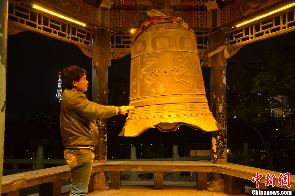 重阳前夕,青海西宁南山顶,一名青年在南山寺撞钟。当晚,当地市民深夜登高祈福,迎接重阳节的到来。中新社发 赵帅 摄