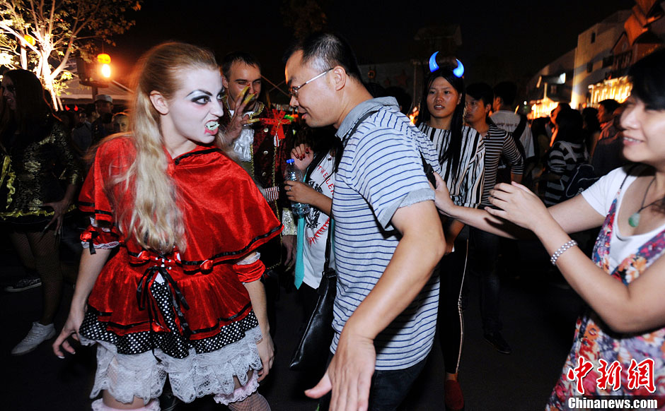 10月12日晚,武汉欢乐谷上演盛大的鬼怪巡游,恶灵和生化危机丧尸冲破禁锢,浩浩荡荡的游荡在园区的各个角落;“笨鬼一家亲”上演滑稽搞笑互动秀;“幽冥赶尸队”中的僵尸挣脱棺材的束缚,加入到时尚潮趴秀中百鬼出笼、群魔乱舞、万鬼狂欢,与游客上演人鬼奇遇记。中新社发 张畅 摄