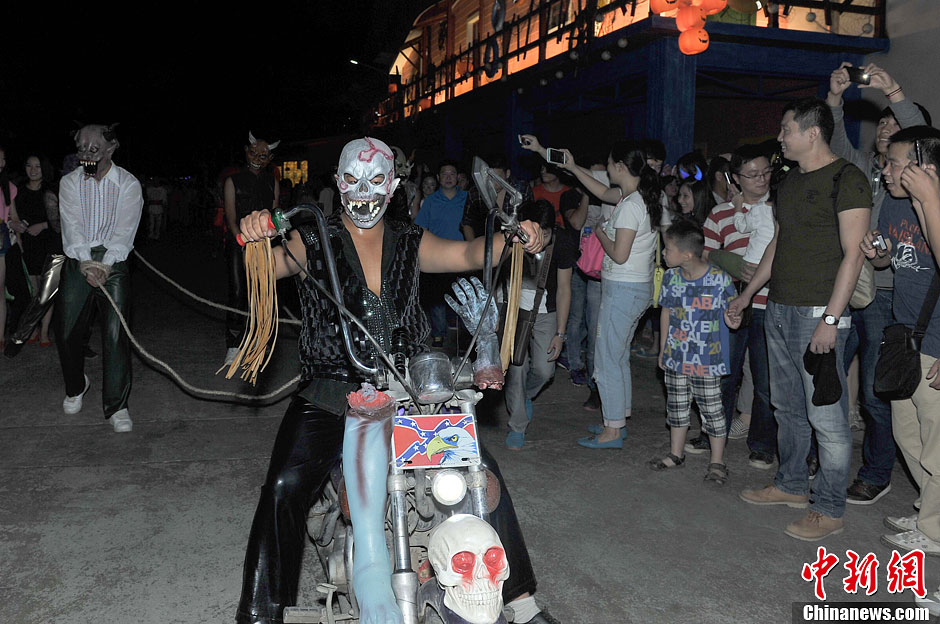 10月12日晚,武汉欢乐谷上演盛大的鬼怪巡游,恶灵和生化危机丧尸冲破禁锢,浩浩荡荡的游荡在园区的各个角落;“笨鬼一家亲”上演滑稽搞笑互动秀;“幽冥赶尸队”中的僵尸挣脱棺材的束缚,加入到时尚潮趴秀中百鬼出笼、群魔乱舞、万鬼狂欢,与游客上演人鬼奇遇记。中新社发 张畅 摄