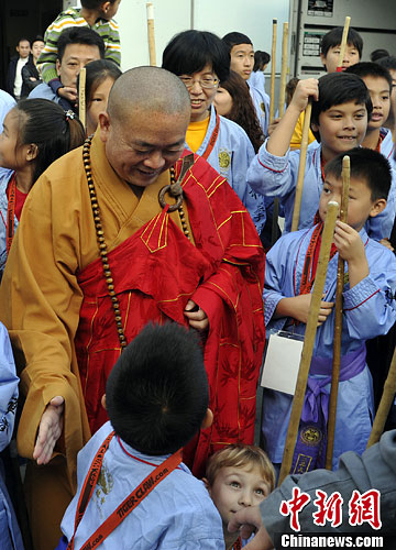图为少林寺释永信方丈与参加武术交流的儿童们交谈。中新社发 毛建军 摄