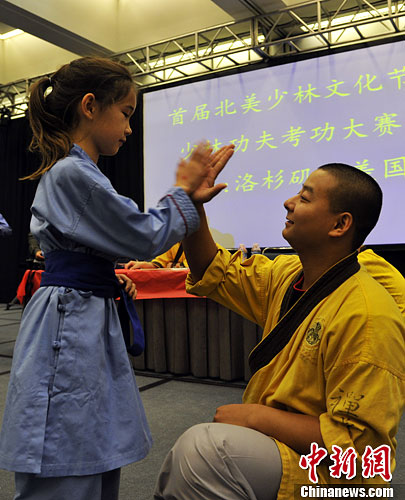 图为一名武僧与刚刚考得“蓝带”级别的小学员击掌庆祝。中新社发 毛建军 摄