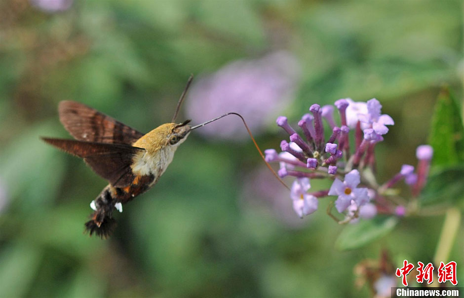 日前,一只蜂鸟蛾现身湖北省宜都市潘家湾土家族乡梁山村,摄影爱好者用镜头拍下了它的各种飞行姿态,很是惹人喜爱。图为蜂鸟蛾穿梭于花丛中。曹礼达 摄