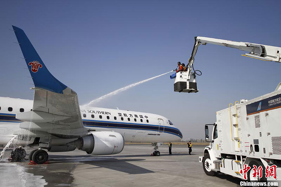 10月14日,南航新疆分公司维修基地针对今年新疆早入冬的气候特点,积极练兵进行除防冰演练。以ERJ190飞机为演习模拟机,分别对飞机的大翼、尾翼进行了除冰实战,为今冬明春的飞机除防冰工作做好“热身”。冯明远 摄