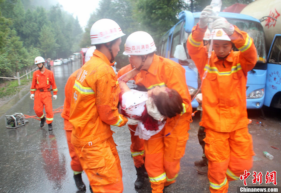 10月14日下午3时左右,四川巴中市巴州区水宁寺镇境内发生一起交通事故,一辆由巴中开往平昌县的客车与一辆罐车发生碰撞,已造成6人死亡,14人受伤。目前,伤者已全部送往当地医院救治,事故具体原因交警还在调查中。图为一名伤者成功救出。孟佳 摄