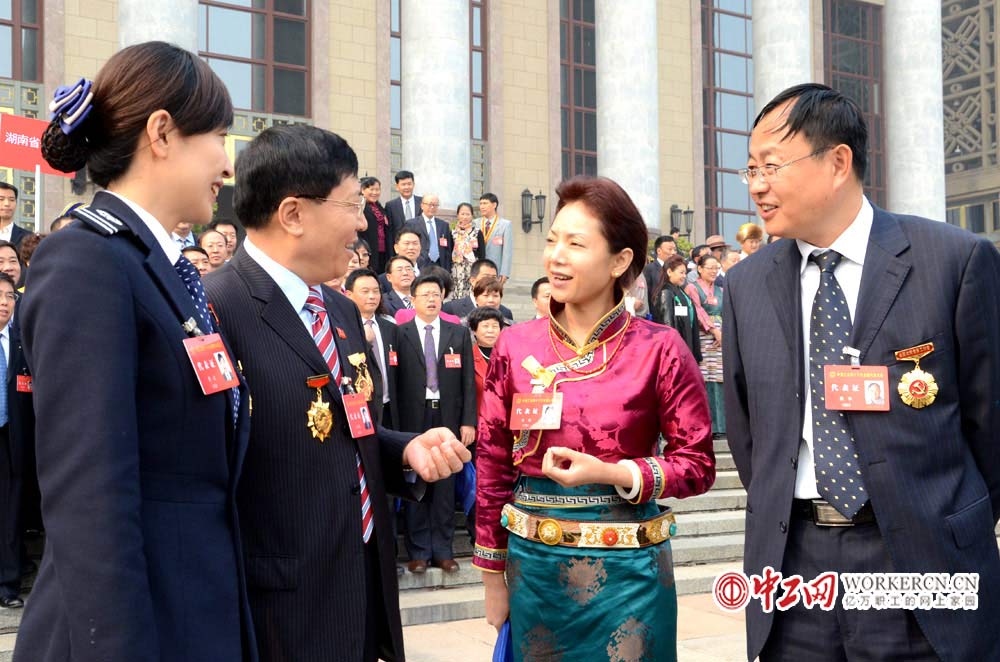 中国工会第十六次全国代表大会10月18日上午在北京人民大会堂开幕。图为开幕式后,与会代表在北京人民大会堂外相互交流。 中工网记者 笑语摄