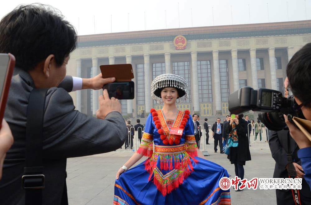 中国工会第十六次全国代表大会10月18日上午在北京人民大会堂开幕。图为开幕式后,与会代表走出北京人民大会堂,一位少数民族代表的精美服饰成为了代表们和记者关注的焦点。 中工网记者 笑语摄