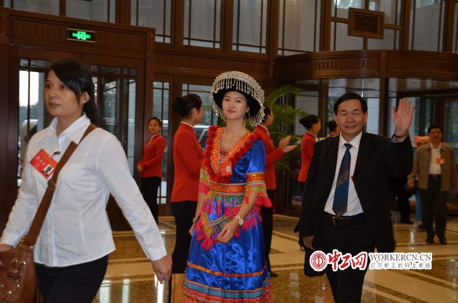 2013年10月16日,参加中国工会第十六次全国代表大会的各代表团代表陆续抵京。图为广西代表团代表到达京西宾馆住地。中工网记者 秦笑语 摄