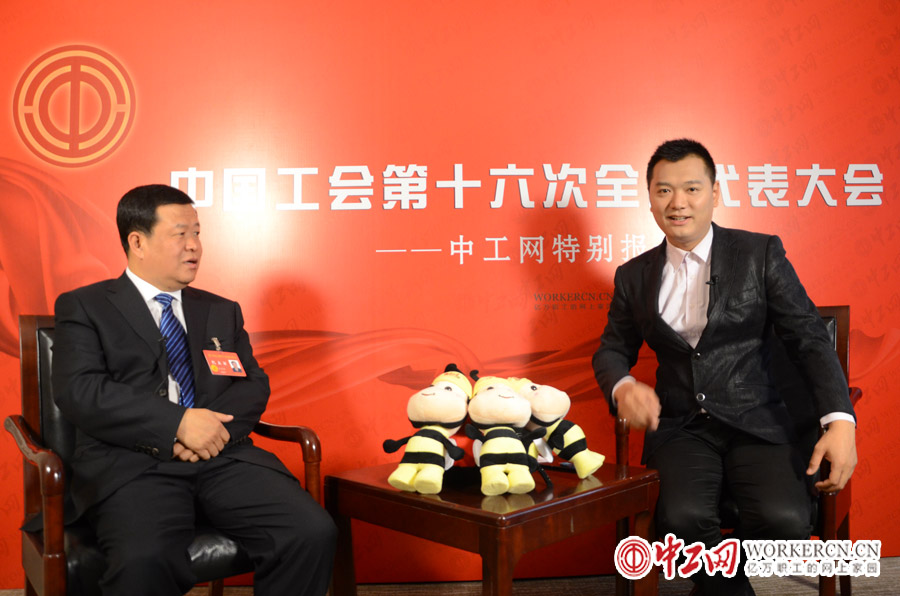 10月18日,中国工会第十六次全国代表大会在北京人民大会堂召开。为做好报道工作,中工网在京西宾馆大会新闻中心临时搭建演播室,为来自全国各地的一线基层代表进行一对一的访谈。图为中国工会十六大代表、黑龙江省肇东市总工会主席牟国良做客中工网现场演播室。 (中工网记者 笑语摄)
