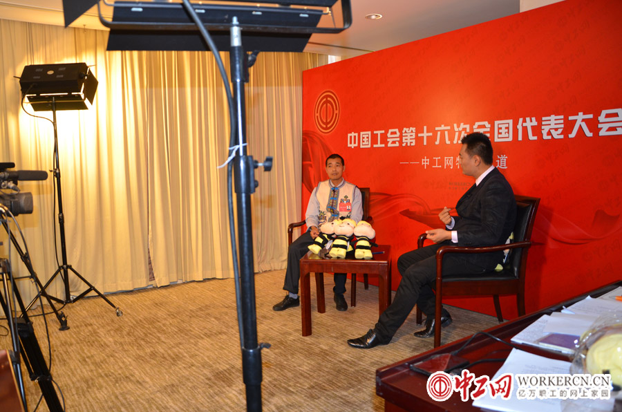10月18日,中国工会第十六次全国代表大会在北京人民大会堂召开。为做好报道工作,中工网在京西宾馆大会新闻中心临时搭建演播室,为来自全国各地的一线基层代表进行一对一的访谈。图为中国工会十六大代表、四川省兴文县华福集团公司采煤班班组长杨学林做客中工网现场演播室。 (中工网记者 笑语摄)