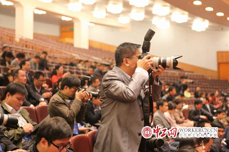 图为参与报道的记者在人民大会堂用相机记录下盛会的精彩瞬间。中工网摄影记者 姚星 摄